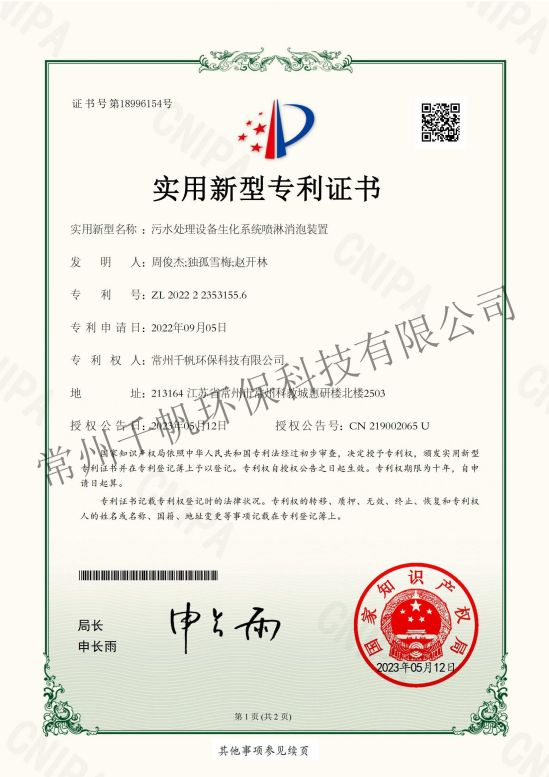 實(shí)用新型專(zhuān)利證書(shū) 污水處理設(shè)備生化系統(tǒng)噴淋消泡裝置